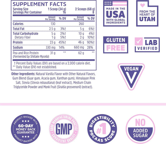 Vanilla Plant Based Vegan Protein Powder, High Digestibility, Complete Amino Acid Profile, Dairy Soy Gluten Sugar Free, 21g Protein, 16 Servings