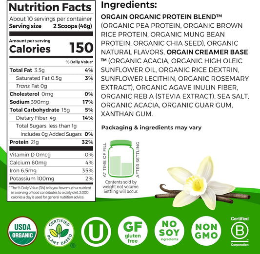 Orgain Organic Vanilla Bean Vegan Protein Powder - 21g Plant-Based Protein, 4g Prebiotic Fiber, Non-GMO, No Added Sugar, Lactose-Free, Ideal for Shakes & Smoothies - 1.02 lb