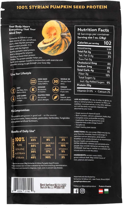 Schlacher & Söhne SS 1889 Styrian Pumpkin Seed Protein Powder 17.6 oz - Pure Plant Protein, Non-GMO, Gluten-Free, Vegan, Immune System Boost, Digestion Support - Made in Austria