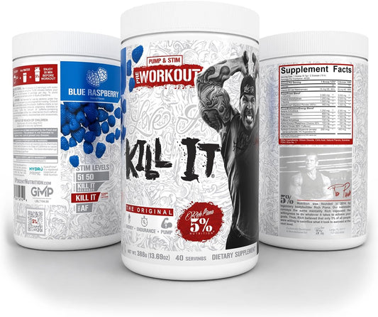 5% Nutrition Rich Piana Kill It Pre Workout Powder - Boost Strength, Endurance, and Pump with Creatine, Caffeine, Beta Alanine, and Hydroprime Glycerol - Blue Raspberry Flavor - 13.69 oz, 40 Servings