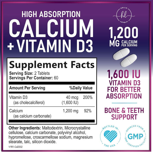 High Absorption Calcium Supplement for Women - 1200mg with 1600IU Vitamin D3 for Bone, Teeth & Immune Support - Premium Calcium Carbonate Tablets - 120 Count