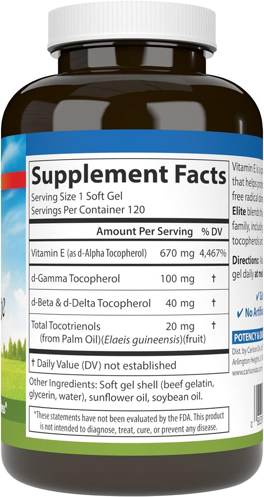 Carlson E-Gems Elite Vitamin E Soft Gels - 1000 IU with Tocopherols & Tocotrienols for Heart Health & Antioxidant Support - 120 Count