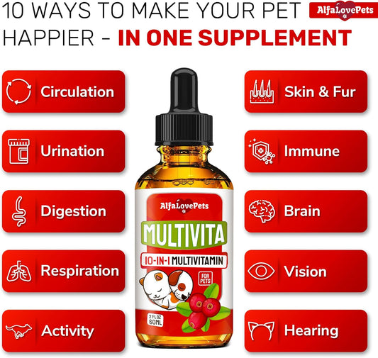 Alfa Love Pets Liquid Multivitamin for Dogs and Cats - 10-in-1 B Complex, C, D3 - Supports Digestion, Urination, Hip & Joint, Skin & Coat - Cranberry Flavor - 2 Oz
