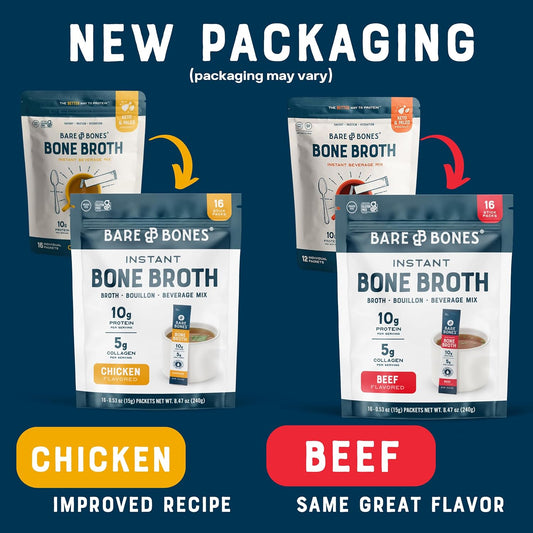 Variety Pack Bone Broth Instant Powdered Beverage Mix, Chicken & Beef - 32 Pack, 15g Sticks, 10g Protein - Keto & Paleo Friendly