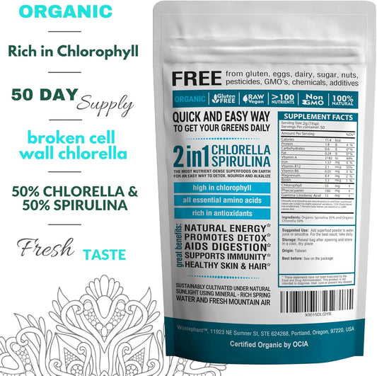 Organic Chlorella Spirulina Powder | Super Greens Mix for Energy | Rich in Chlorophyll | Immune Support | Raw Vegan Protein | 50 Servings
