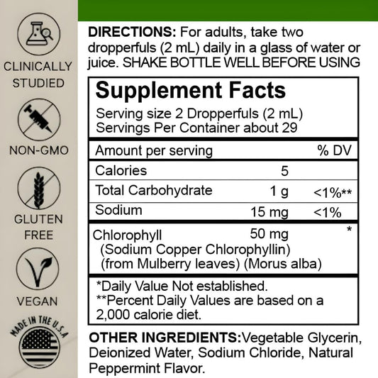 MaryRuth Organics Non-Diluted Liquid Chlorophyll Drops - Mulberry Derived, Clean Label Project Certified®, Vegan, Non-GMO, Minty Flavor - 2 Fl Oz