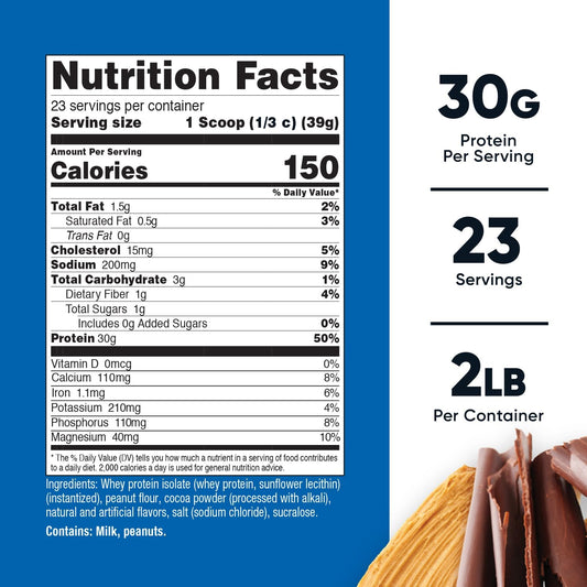 Chocolate Peanut Butter Whey Protein Powder - Low Calorie Isolate, Non-GMO, Lactose-Free, Sugar-Free - Grass Fed (60 Servings)