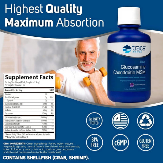 Blueberry Flavored Liquid Glucosamine Chondroitin MSM with Trace Minerals - Complete Dietary Supplement for Joint Health and Mobility - 16 Servings, 16 fl oz