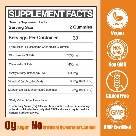 Extra Strength Sugar Free Glucosamine Chondroitin Gummies with Vitamin C for Immune Support - 1500mg Glucosamine - 60 Count - Adults, Men & Women