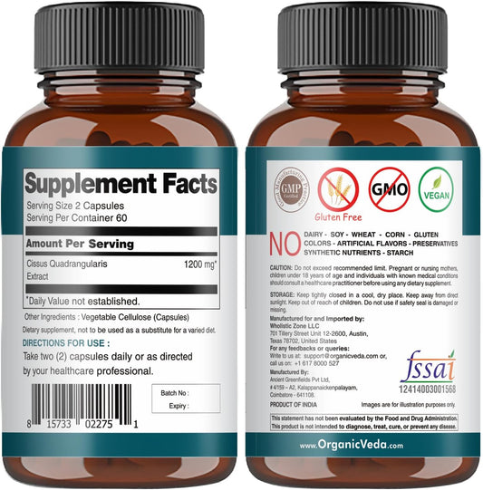 Super Concentrated Organic Veda Cissus Quadrangularis Extract Capsules 1200mg - Joint & Tendon Support Supplement - 120 ct