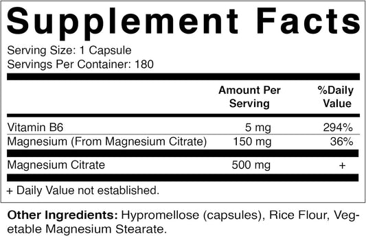 180 Vegetarian Capsules of Vitamatic Magnesium Citrate with 500mg per Serving - Enhanced with B6 for Maximum Absorption - Promotes Muscle, Joint, and Heart Health - 150 mg Elemental Magnesium per Serving