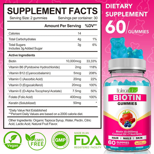 Chewable Biotin Gummies for Hair Growth & Nails - Vitamins with Coconut Oil - 10,000 mcg Hair Supplement for Loss & Skin