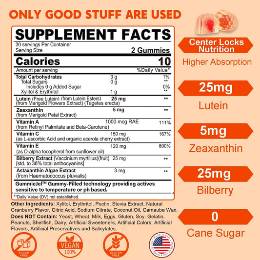 2 Pack Sugar-Free Lutein Zeaxanthin Gummies - 25mg Vitamins A, C, E, Bilberry, Astaxanthin - Coconut Oil for Better Absorption - Adults Vision, Eye, Brain, Skin Health - Vegan