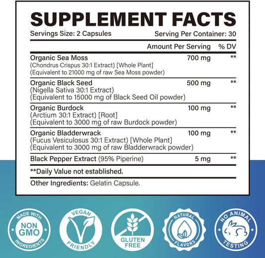 Advanced Irish Sea Moss Multi Minerals Supplement with Cofure Sea Moss, Black Seed Oil, Burdock Root, and Bladderwrack for Energy, Immune Support, and Gut Health - Non-GMO and Gluten Free