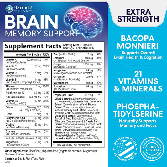 Brain Health Nootropic Supplement for Memory, Focus & Energy - Cognitive Support with Bacopa, Vitamins, DMAE - 120 Capsules