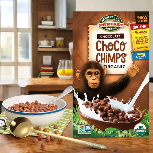 Organic Gluten-Free Choco Chimps Cereal Bundle with Golden Spoon - 10oz x 4 Pack - Vegan, Non-GMO, Kid-Friendly, Supports Wildlife Conservation, Rich Flavor