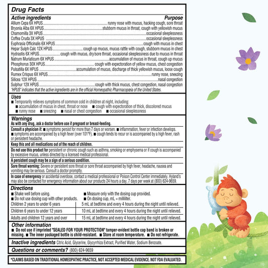 Hyland's Nighttime Cold 'n Mucus Relief Liquid for Kids Ages 2+, Natural Relief of Mucus, Congestion, Runny Nose, Cough - 4oz