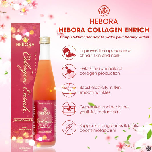 HEBORA Collagen Enrich Japan Liquid Drink - 160,000mg Marine Collagen Peptide + 112 Enzym Peptide Vegie + Damask Rose - Improve Hair, Nails, Skin, and Joints - 16.9 fl oz Bottle