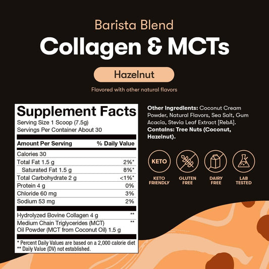 Keto Barista Blend Collagen Coffee Creamer Powder with MCT Oil - Dairy Free, Low Sugar, Grass Fed - Energy & Skin, Hair, Nail Support - Hazelnut Flavor