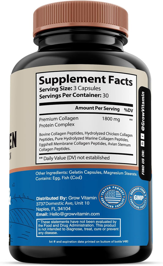 Non GMO Multi Collagen Capsules 1800MG with Types I, II, III, V & X - Grass Fed Anti Aging Support for Hair, Skin, Nails - 90 Capsules for Joint & Protein Support