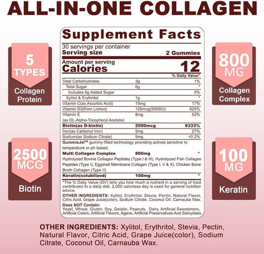 Hydrolyzed Collagen Peptides Gummies 800mg, Sugar-Free with Multi Peptides Type I II III V & X, Biotin, Keratin, and Vitamins for Healthy Skin Hair Nails, Bone & Joint Support - 1 Pack