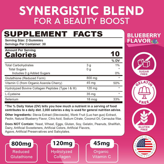 Sugar-Free Glutathione Collagen Gummies for Women with L-Cysteine, Vitamin C & Selenium - 120Cts - Vegan Anti-Aging Antioxidant Supplement
