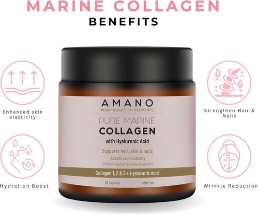 AMANO BEAUTY Pure Marine Collagen Supplement with Hyaluronic Acid and Vitamin C - GMO-Free Formula for Skin, Hair, Nails, and Joints - 30-Day Supply