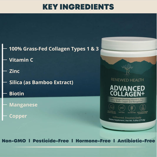 Renewed Health Advanced Collagen Plus Powder with Vitamin C, Biotin, Zinc, and More - 30 Servings, Grass-Fed