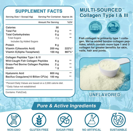 Marine Collagen Peptides Powder with Probiotics, Vitamin C & Hyaluronic Acid for Skin, Hair, Nails & Joints - Type I & III Collagen from Wild-Caught Fish & Grass-Fed Bovine, 35 Servings
