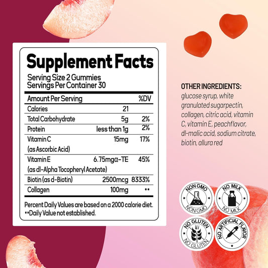 Peach Flavored Collagen Gummies with Biotin for Hair, Skin, and Nails - 30 Day Supply, 60 Count