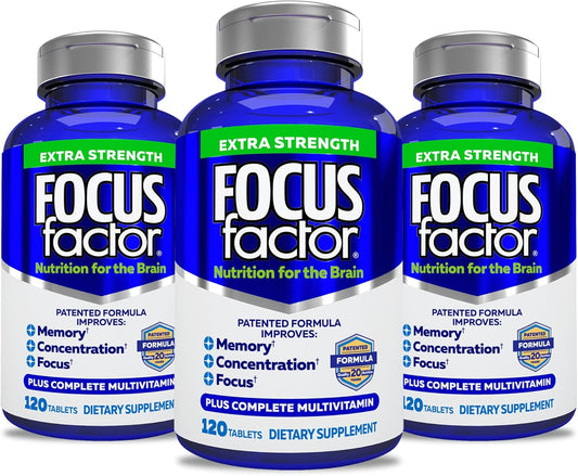 Brain Health Supplement for Adults - Focus Factor Extra Strength, 120 Count - Memory, Concentration, Focus Support - DMAE, Vitamin D, DHA - Trusted Formula for Brain Vitamins and Focus Pills (3 Pack)