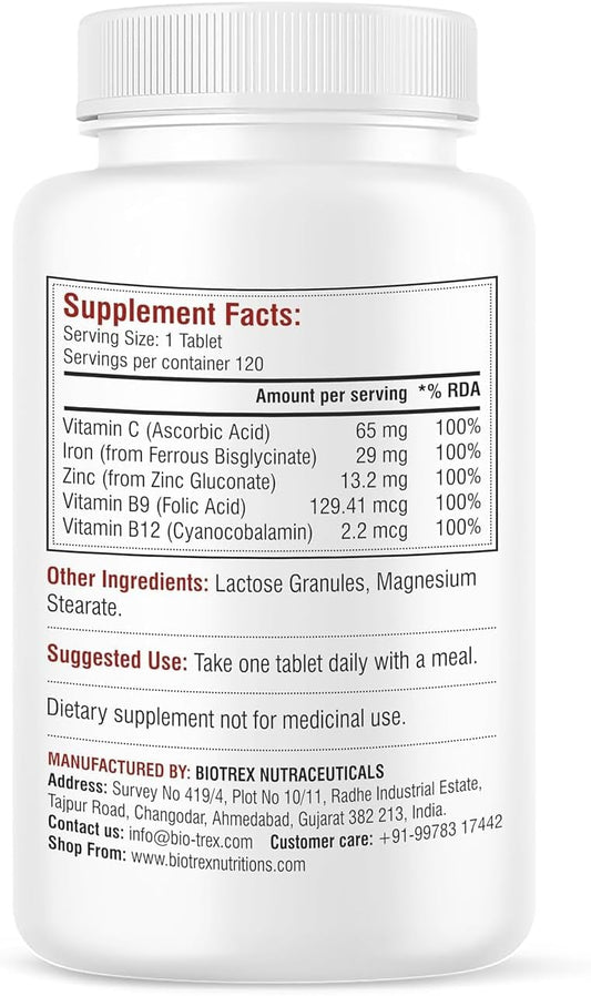 Chelated Iron with Vitamin C, B12, Folic Acid, and Zinc - 120 Vegetarian Tablets for Energy, Concentration, and Hemoglobin Boost
