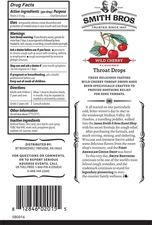 Smith Bros. Wild Cherry Sore Throat Drops with Pectin - Vintage Candy Lozenges - American Cough Drops 30ct Bag