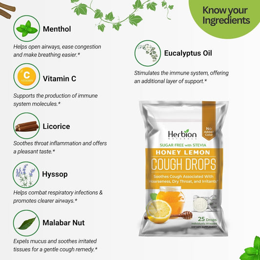 Herbion Naturals Cough Drops with Natural Honey Lemon Flavor - Sugar-Free, Stevia Sweetened, 25 Drops - Soothes Cough for Adults & Children 6+ - No Artificial Ingredients