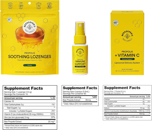 Natural Immune Support Kit with Propolis Throat Spray, Honey Cough Drops, and Vitamin C Liposomal for Effective Sore Throat Relief