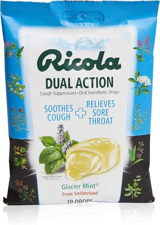 Pack of 4 Ricola Dual Action Glacier Mint Herbal Cough Suppressant Throat Drops, 19ct Bags - Soothes Throat & Suppresses Coughs