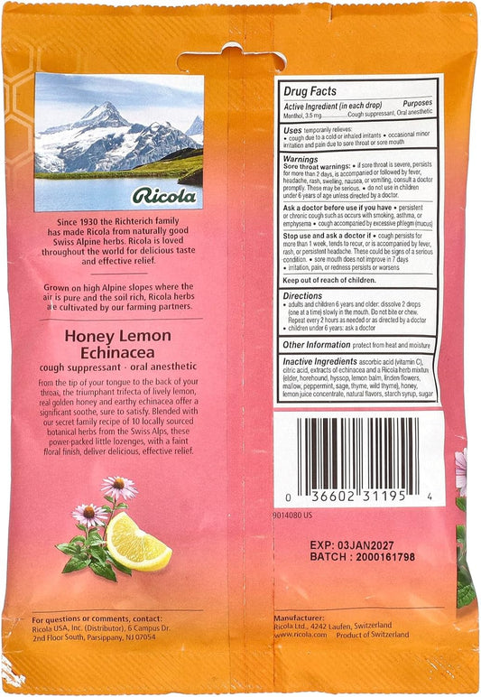 Ricola Honey Lemon Echinacea Cough Suppressant Throat Drops - 19 Count Pack - Soothes Sore Throat & Suppresses Coughs - Natural Relief