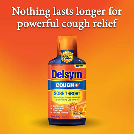 Delsym Adult Liquid Cough and Sore Throat Honey 6 oz - Pack of 2 - Soothing Relief for Adults