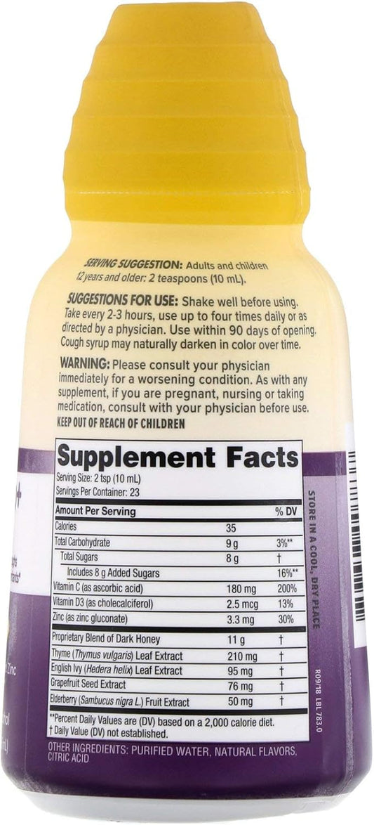 Zarbee's Adult Daytime Immune Support Cough Syrup with Honey, Elderberry, Vitamin C & Zinc - Drug & Alcohol-Free, Gluten-Free Liquid for Ages 12+ - Natural Berry Flavor - 8 Fl. Oz