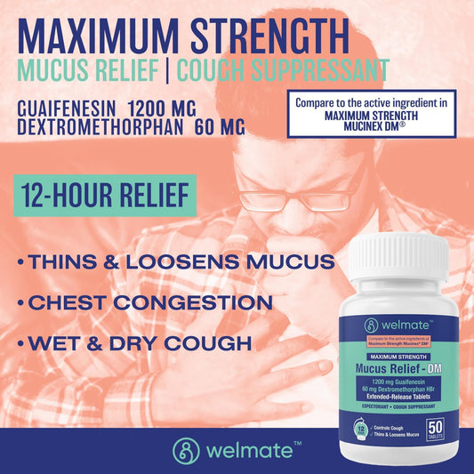 Maximum Strength Mucus Relief DM Tablets - 1200mg Guaifenesin & 60mg DXM, 12-Hr Cough Suppressant & Expectorant, Chest Congestion Relief, 50 Ct