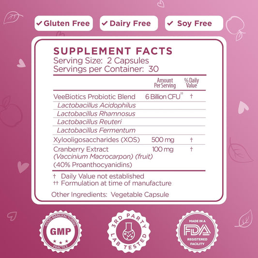 VeeFresh VeeBiotics Women's Probiotics with Cranberry Extract - 60 Capsules for Vaginal Health & pH Balance, Probiotics with Prebiotics for Overall Wellness
