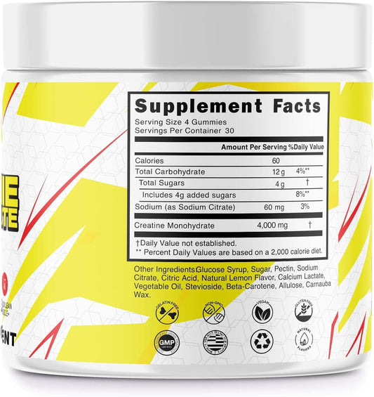 Vegan Lemon Flavored Creatine Monohydrate Gummies - 5g per Serving - 120 Count for Men & Women by Ceres Nature