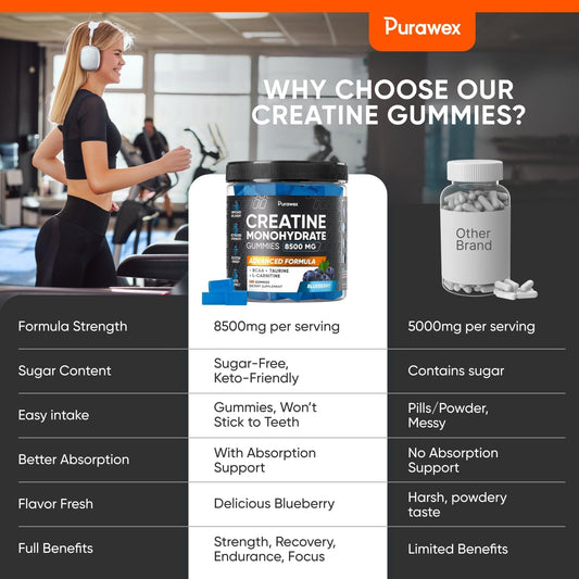 High Strength Purawex Creatine Gummies - Pre-Workout Supplement for Muscle Strength and Energy - Vegan Blueberry Flavor - 120 Count