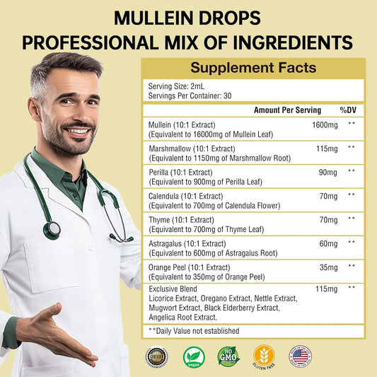 Vegan Mullein Leaf Extract Drops for Lung Detox & Immune Support 1600MG - Non-GMO Respiratory Supplement with Marshmallow Root, Perilla, Orange Peel - 2 Fl OZ