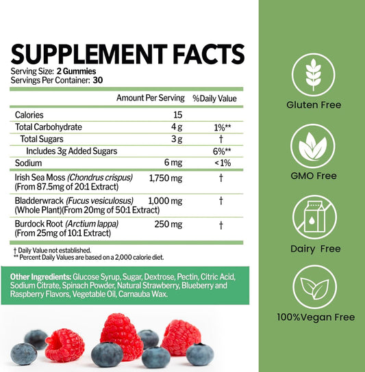 Wildcrafted Irish Sea Moss Gummies with Bladderwrack & Burdock Root - Vegan Immune & Thyroid Support - Non-GMO, Gluten-Free - 60 ct.