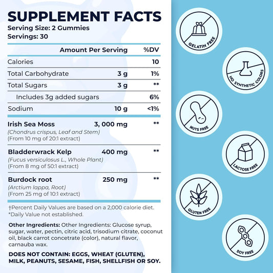 Irish Sea Moss Gummies with Burdock Root & Bladderwrack - 60 Count for Immune Support, Skin & Hair Health - Detox Supplement for Kids & Adults - Made in USA