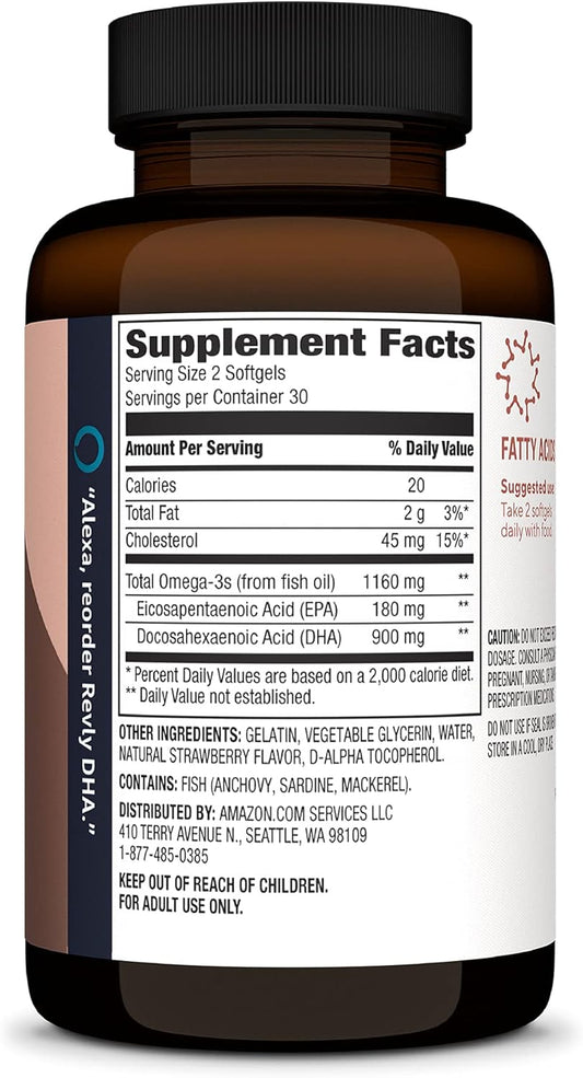 Revly Adult DHA Omega 3 Fatty Acids Softgels, Natural Strawberry Flavor, 900mg Per Serving, 60 Count