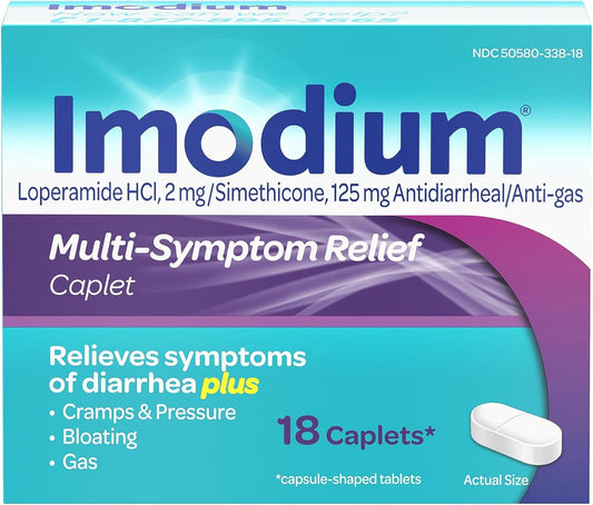 Imodium Multi-Symptom Relief Caplets - 18 ct, Loperamide Hydrochloride & Simethicone for Diarrhea, Gas, Bloating, Cramps & Pressure