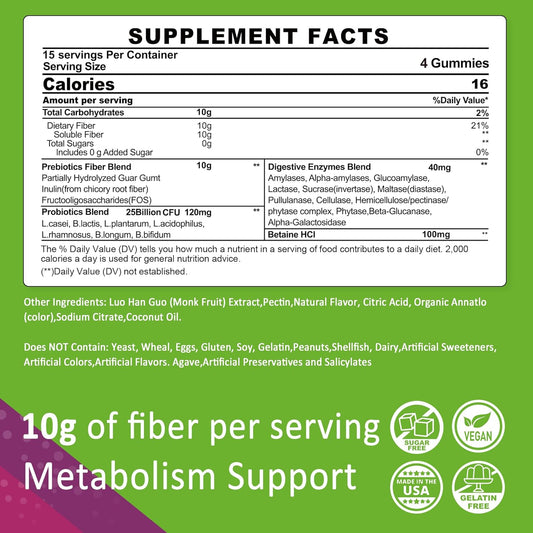 Sugar Free Fiber Gummies for Adults with Prebiotic Fiber, Digestive Enzymes, Probiotics, Betaine - Vegan 120ct. Improve Digestive Health & Bowel Regularity.