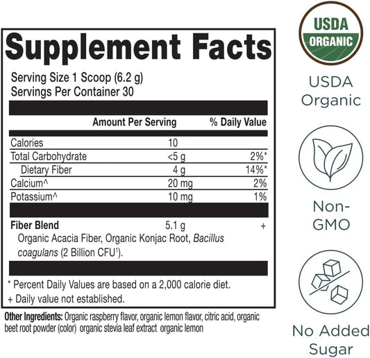 Organic Raspberry Lemonade Fiber Powder with Acacia & Konjac Root for Digestive Health - 6.5 oz